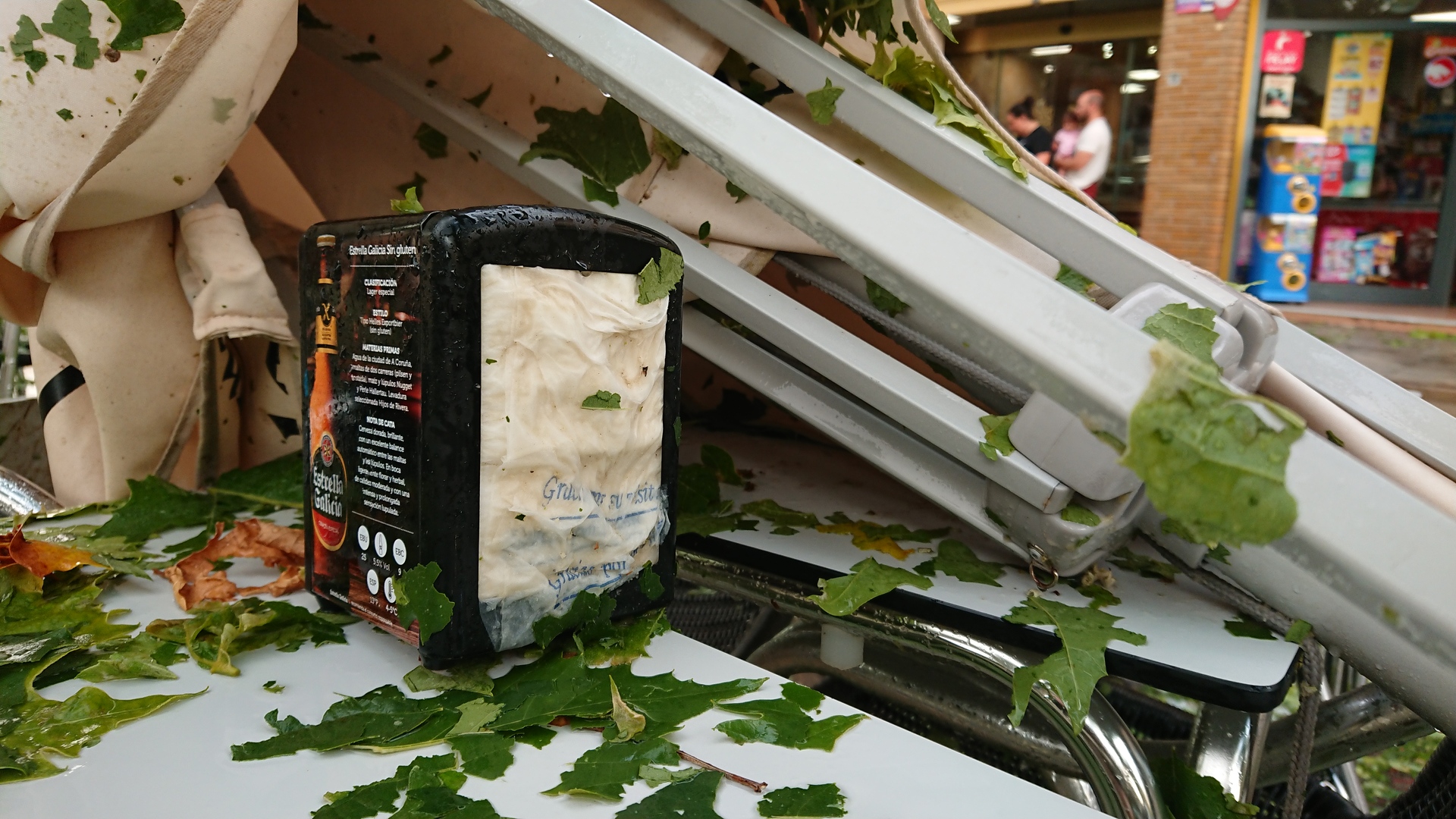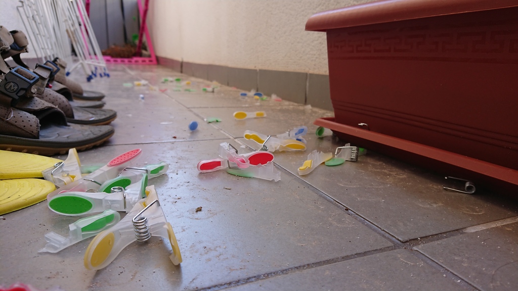 Above: What our balcony looked like on the next day. Specifically pegs that got broken from the hail.