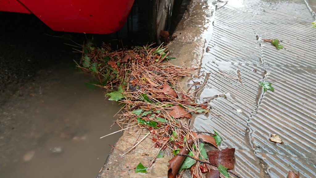 Above: Soaked serviette dispenser beside a collapsed umbrella. (Close-up)